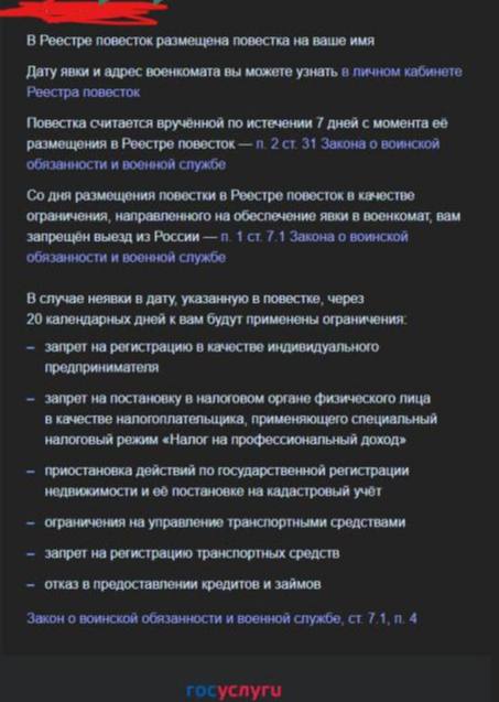 Виопазка, отправленная в цифровом формате, считается полученной через 7 суток после размещения в реестре. В скором времени гражданину будет запрещено выезжать за пределы РФ, зарегистрировать ИП, оформить кредит или ипотеку. Это беспрецедентный случай в России — ранее такие повестки не направлялись через указанный реестр.