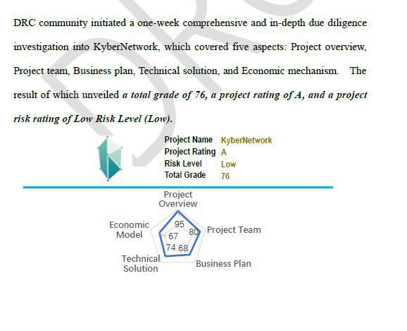 DRC đã nghiên cứu chi tiết và chuyên sâu về mạng Kyber Network. Họ đặc biệt xem xét về tổng quan dự án, nhóm dự án, kế hoạch kinh doanh, giải pháp công nghệ và cơ chế kinh tế của Kyber Network. Để cung cấp cho bạn một cái nhìn bao quát về những gì các báo cáo thể hiện, hay nói cách khác là cách đánh giá của DRC, dưới đây tôi sẽ cung cấp cho các bạn thấy sơ bộ bản đánh giá trị giá 20.000 USD này: