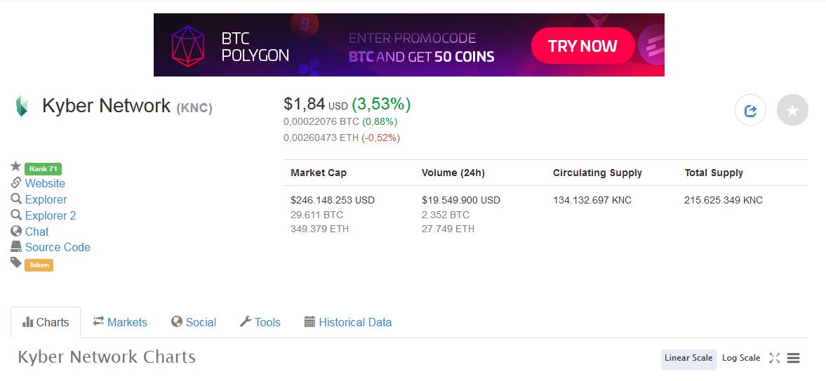 Tính đến thời điểm hiện tại, Kyber Network hiện đang xếp hạng thứ 72 trên coinmarketcap với tổng vốn hóa 244 234 321 USD.