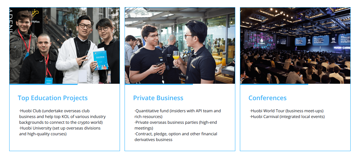 • Lợi ích kinh tế: Huobi sẽ cung cấp một tỷ lệ phần trăm cao giảm giá ưu đãi (lên đến 40% của phí giao dịch) cho thành viên của Huobi Global Elite đồng thời họ cũng sẽ nhận được sự chia sẻ cổ tức của sự phát triển của địa phương mà họ quản lý, được chứng nhận trở thành OTC thương nhân để kiếm được lệ phí, và nhiều hơn nữa.
