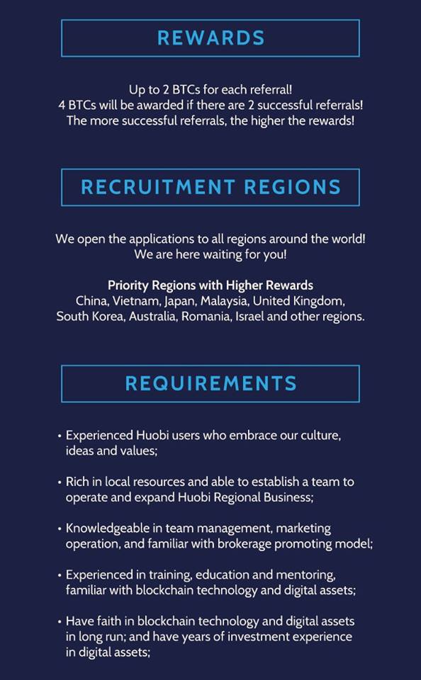 • Những cá nhân/tập thể có hệ thống mạng lưới địa phương lớn, cộng đồng đông đảo và các nguồn lực đủ, cần thiết để thiết lập được một team giúp phát triển cộng đồng và hoạt động kinh doanh khu vực của Huobi.