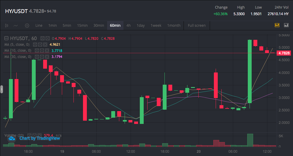 On 2020/05/18, 18:00 (GMT +8) the HY deposits were opened for BiKi users and the trading against USDT was launched. And after that, on 2020/05/20, 18:00 (GMT +8) HY withdrawals became accessible. So now you can enjoy the full trading experience with HY/USDT pair. The trading volume is constantly growing from the very beginning and allows you to buy as much HY as your risk-management strategy allows.