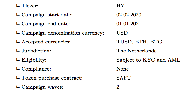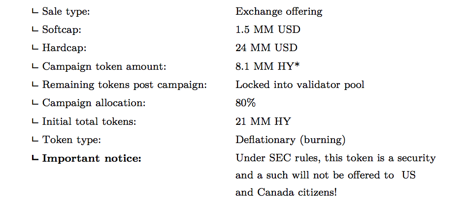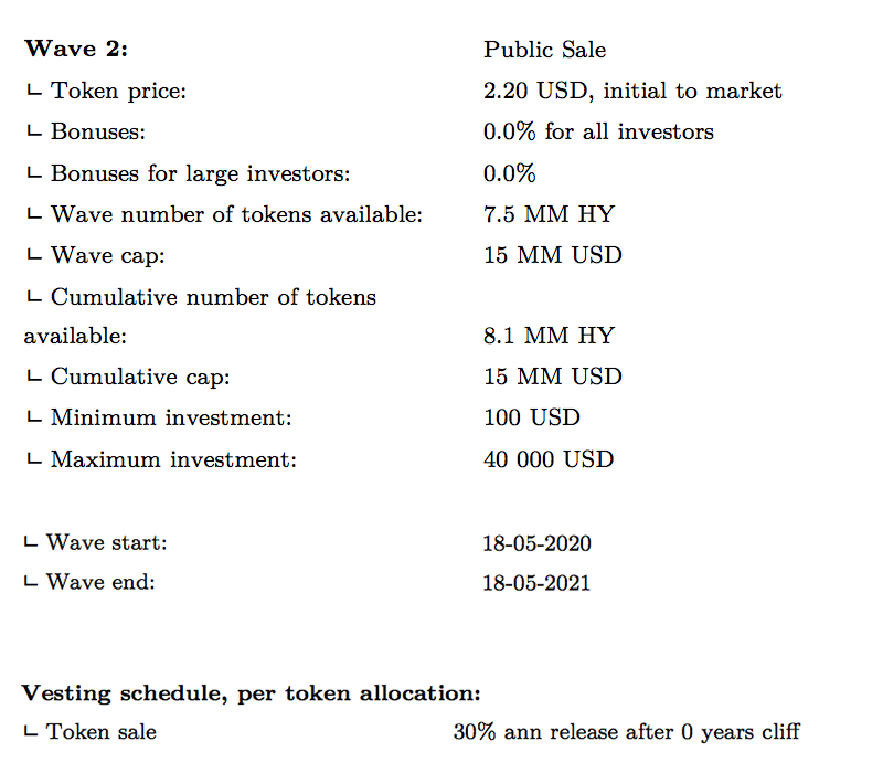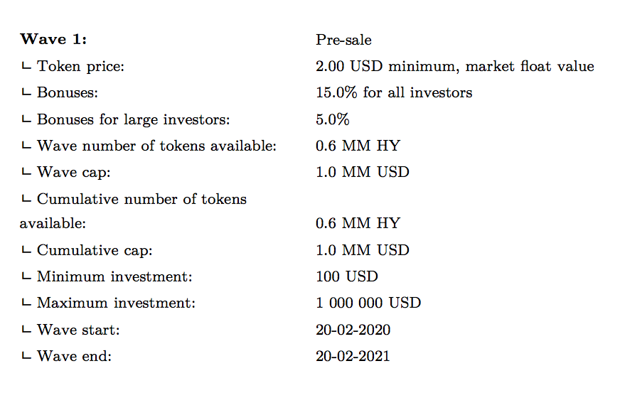ᄂ Pre-sale : 0.6 MM HY sold for 2.00 USD, with bonuses: 15.0% for all investors and 5.0% for large investors (>100 000 USD) = 1.0 MM USD raised