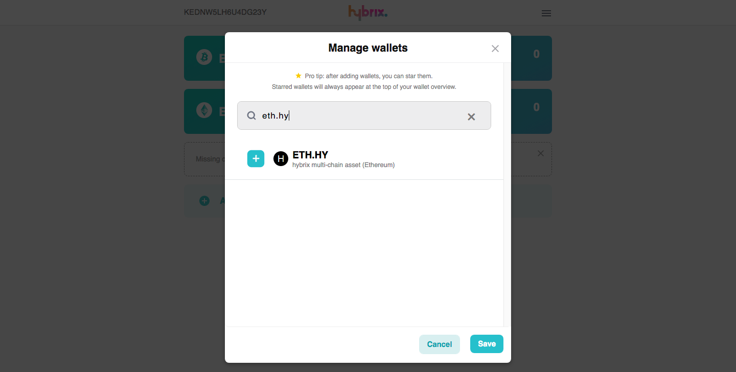 Then type the ticker of token or coin you want to add (I will add HY on the ETH blockchain) and press the "+" and then after "Save" button.