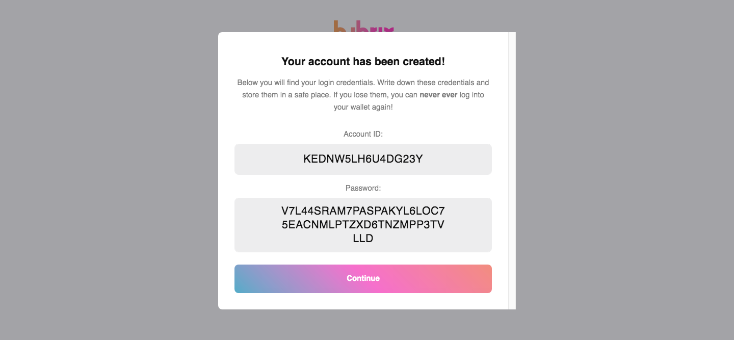 Step 3. Write-down all the generated from your previous step data in a safe place and don't disclose it to any other person. This is your log-in data. Then press the "Continue" button.