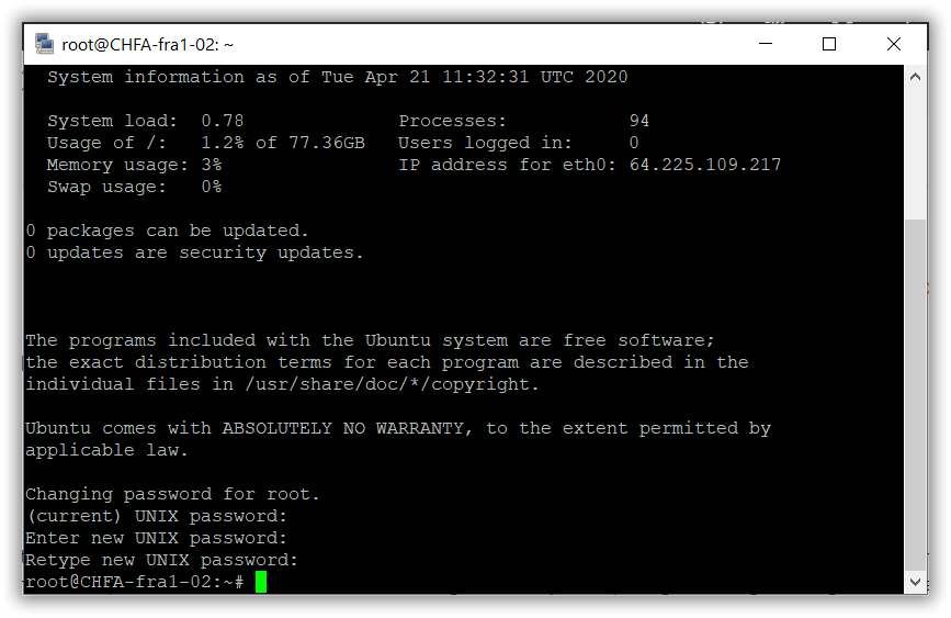 Digital Ocean will ask us to change the password when we connect to our server for the first time. Do so. After password change we should see a similar screen: