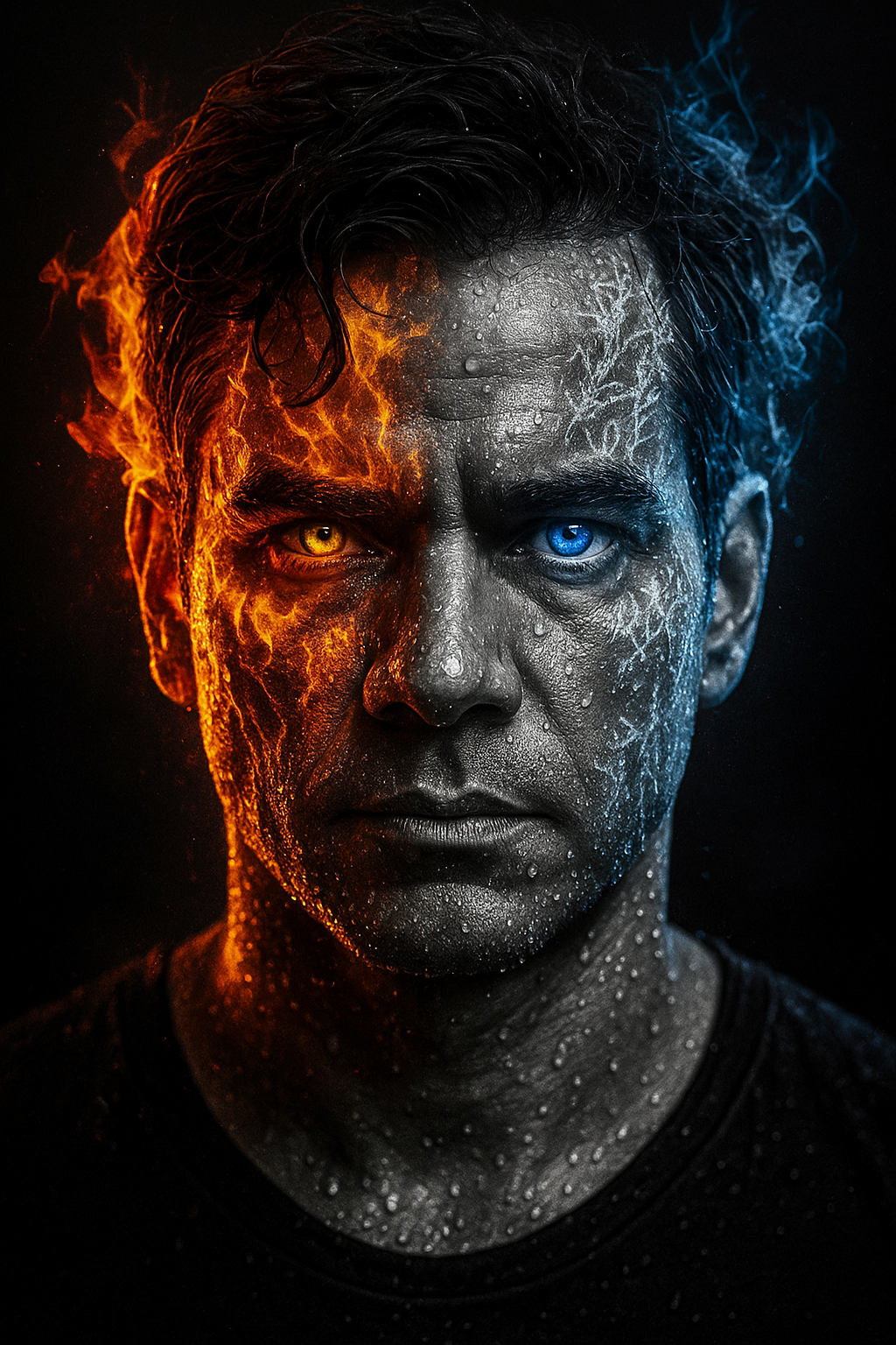Please make a high contrast black and white portrait of my face, focusing on the front of the head in black and white and a small close-up. 35mm lens, 4K HD quality. Proud expression, water drops on my face, black shadow background. Only the face is visible, with my face in sharpest focus. 4:3 aspect ratio, looking straight at the camera. Make the entire left side of my face burned in fire with yellow eye and the entire right side in blue ice with blue eye.