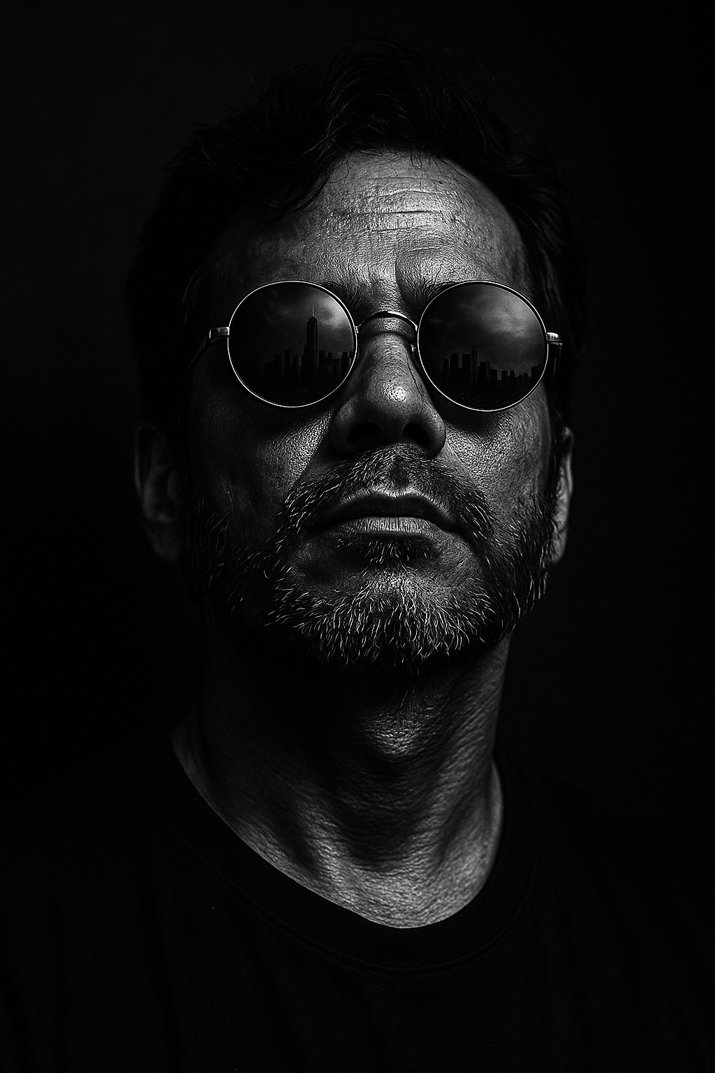 He gazes confidently upward into a dark void. The sunglasses reflect a city's towering skyline. The atmosphere is mysterious with a minimalist black background. Details in 4K. Keep the subject's exact facial structure, hair texture, the original photo