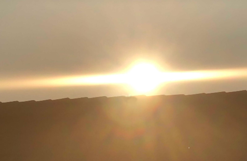 Heute geht unsere Sonne ganz schön in Breite. Nein, natürlich nicht, es ist nur eine Reflexion. Ich habe das Bild durch ein Fliegennetz gemacht!