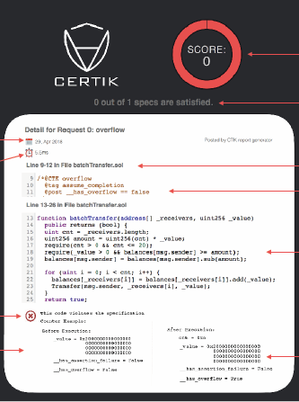 Preuves vérifiables : CertiK génère des tests à partir des spécifications (étiquettes). N’importe qui sera en mesure de faire tourner ces tests sur son ordinateur, et ainsi de vérifier que le smart contract est vérifié. Ces tests décentralisés servent de certificats pour les programmes ainsi validés.