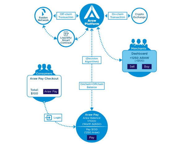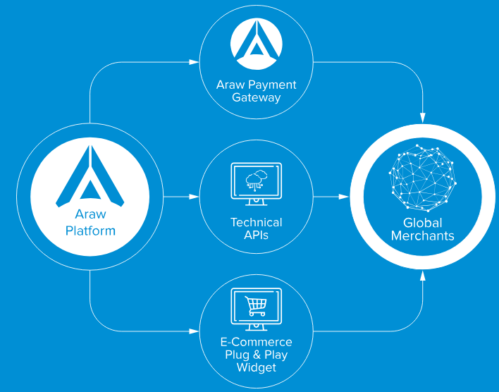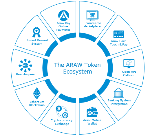 Poskytujte komplexní řešení pro platformu E-Commerce Marketplace, kartu Cryptocurrency Touch & Pay, online platbu CryptoCurrency a systém Unified Reward, který je napájen technologií Ethereum Blockchain regulovanou tokenem ARAW.