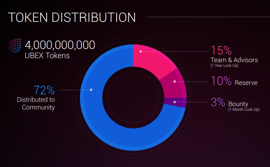 Начальная стоимость одного UBEX равна 0,00001 ETH. Эти токены можно приобрести с использованием таких популярных криптовалют, как: ETH, LTC, BTC. Всего команда разработчиков планирует собрать 24 000 ETH. Распределение токенов после ICO будет выглядеть следующим образом: