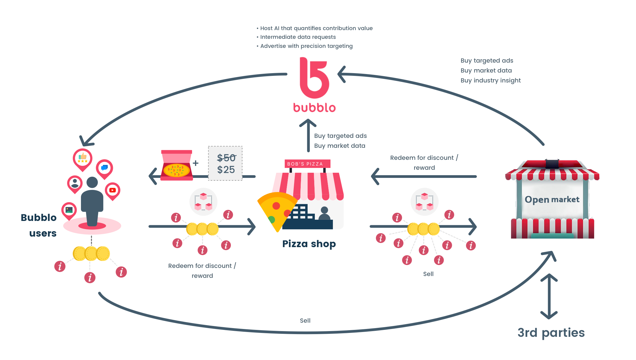 Bubblo is an AI-powered discovery platform which give users a real-time "Top 5" recommendations on restaurants, bars, and other venues based on a constant flow of user-generated data. Users are incentivized to provide this real-time data flow because they earn Bubblo tokens, which can be redeemed for discounts or other rewards at venues and from merchants. For merchants and third parties, these tokens can simultaneously represent the right to retarget its clients whether to collect valuable market insight by exchanging the tokens with Bubblo. All parties thus have the ability to either monetize or protect their data through the token.