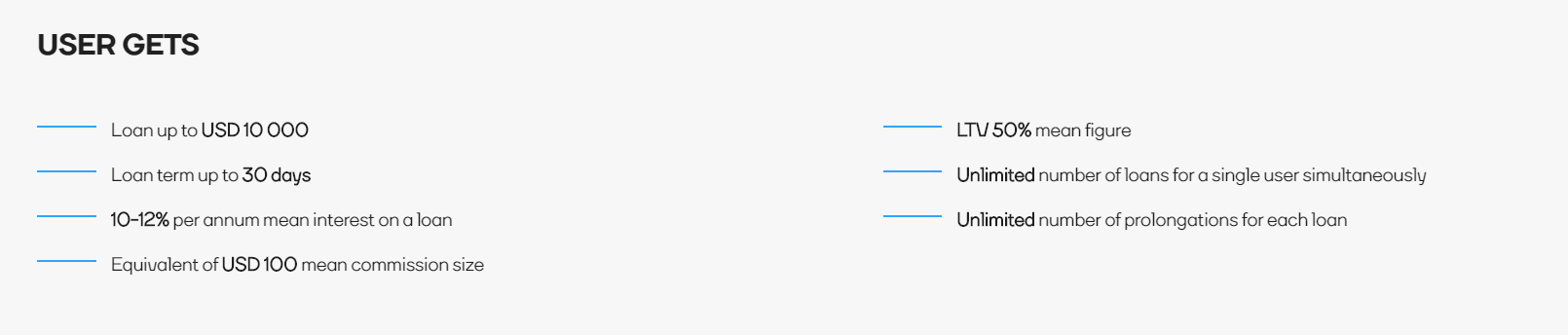 The user can take a loan up to 10 000 USD with the return term of one month. eCoinomic takes 100 USD of commission, which in case of 10k is just 1%. Much less, than any other available service.
