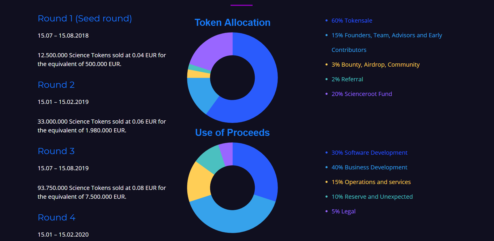 During that time 93.750.000 Science Tokens with the price 0.08 EUR is planned to be sold. The equivalent of 7.500.000 EUR.