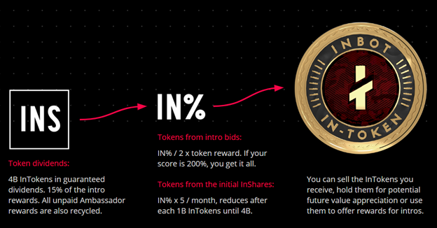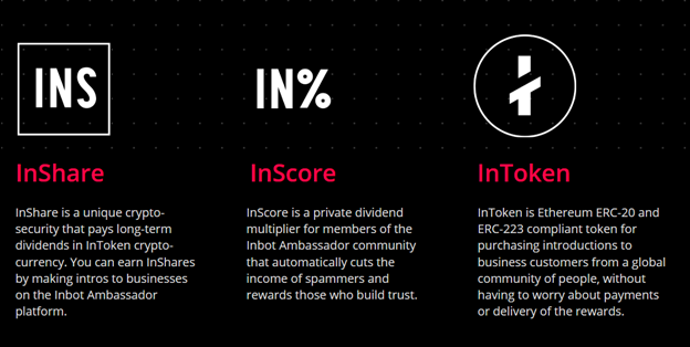 InToken is a utility token that businesses use as a reward for successful introductions to customers. InShares and InTokens earned from InShares are transferred to the official Inbot Ambassador Wallet.