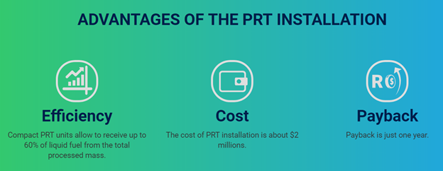 The small-sized PRT-2 units are so efficient that it allow the output of up to 60% of liquid fuel. PRT-2 units will be produced in 3 types of capacity: 30, 60 and 90 tons of processing per day. The new and ready-to-operate PRT-2-30 unit costs about $950,000, which is way less costly than what other competitors can offer. Most importantly, the payback period of the investment on the unit is just around 5-7 months, which is a record for the industry which makes it a great investment considering that you are also helping save the environment at the same time.