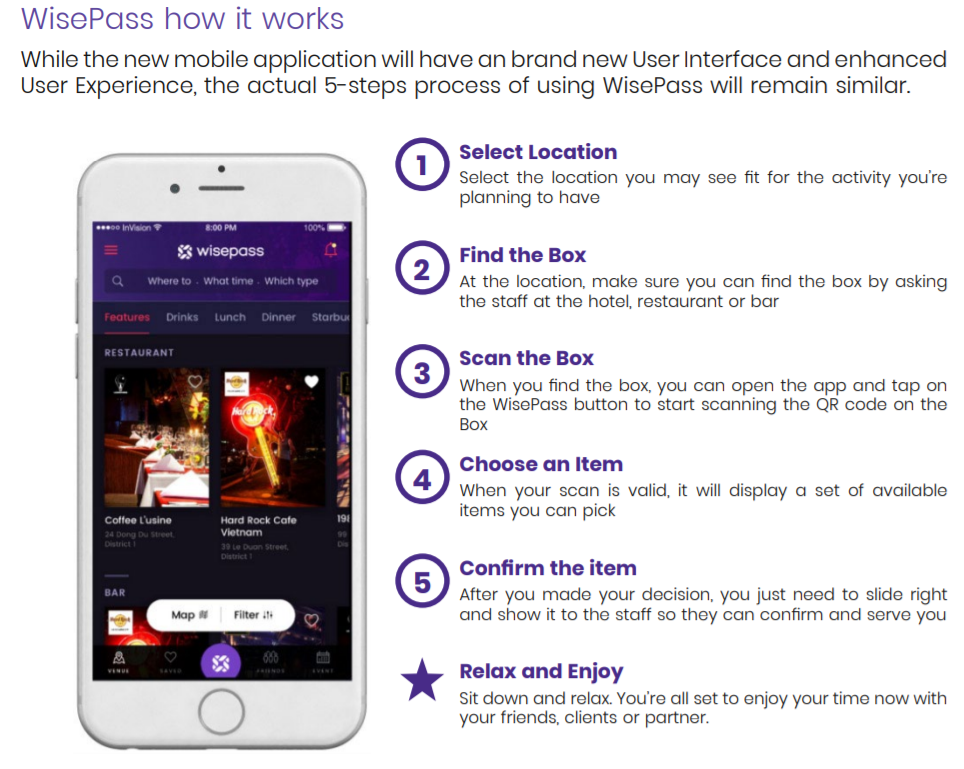 WisePass Pte Ltd. is a Singaporean-based lifestyle platform which started the business in January 2016 and membership sales officially began in August 2016. WisePass connects its members and its partners through a subscription service where its members can enjoy goods and services such as free meals (lunch or dinner), coffee, or a bottle of wine or spirits every day from partners at five-star hotels, restaurants, bars, and nightclubs. WisePass is currently available in Ho Chi Minh City, Hanoi, Bangkok, and Manila. For WisePass they want their members to have a good time that is why they target to open a new city every quarter in 2018 and to expand the complimentary services they offer such as movie tickets, free flights and rides, accommodations and so much more.
