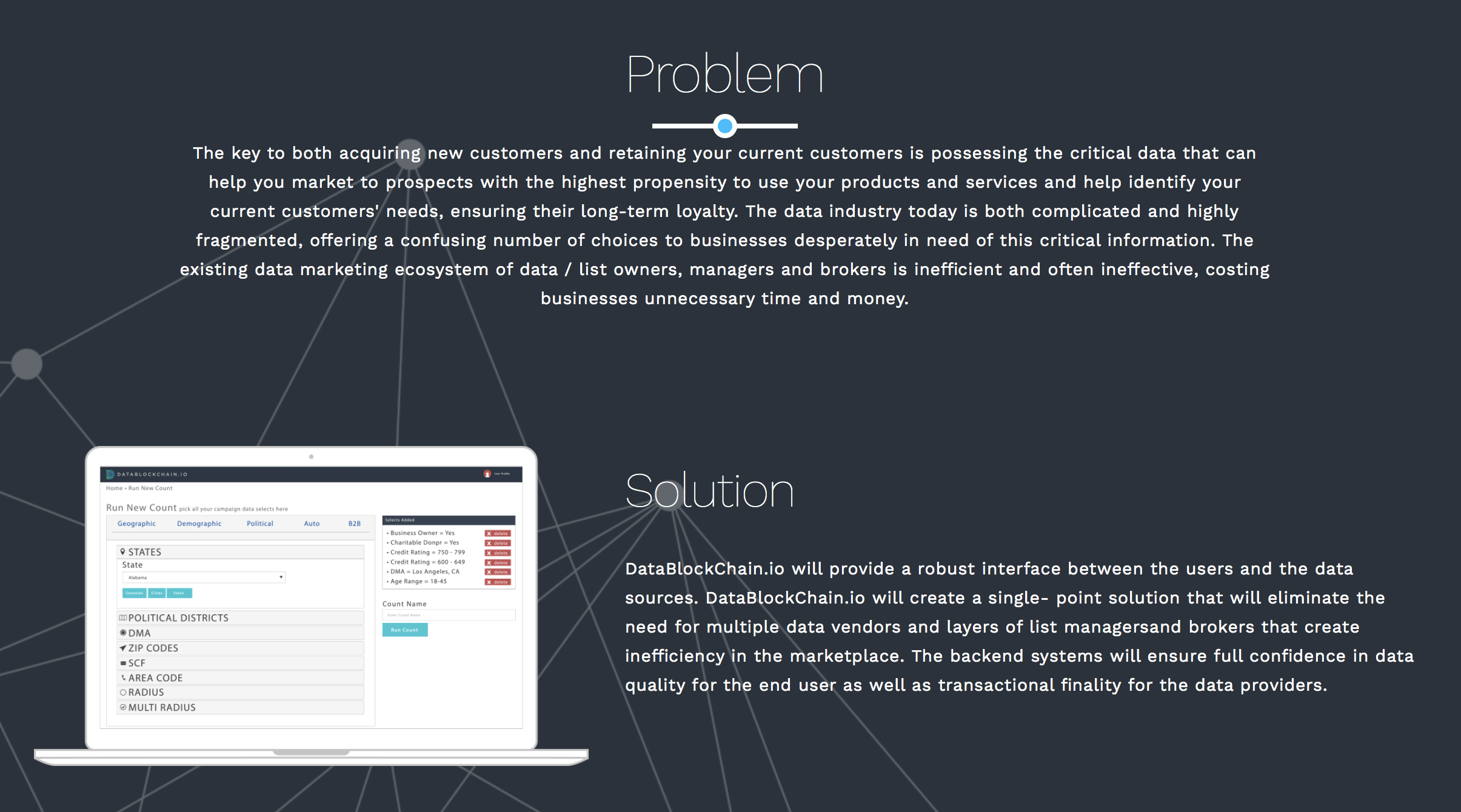 DataBlockChain.io революционизирует отрасль списка данных, устраняя ненужных посредников и создавая более эффективный источник данных и процесс доставки. DataBlockChain.io создаст единый пользовательский интерфейс, чтобы позволить сущности искать различные и разнообразные источники данных для записей, соответствующих их параметрам поискового запроса. Параметры могут варьироваться от географических, демографических, психографических и поведенческих атрибутов. Один запрос мог бы охватывать сотни источников и миллиарды записей.