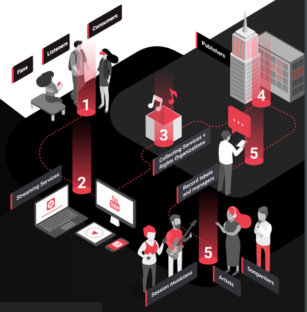 Việc chuyển đổi dần sang phương tiện truyền thông kỹ thuật số đã cho thấy rằng nhiều người sáng tạo nội dung kiếm được rất ít từ công việc của họ. Hiện tại, người sáng tạo nội dung bị các tổ chức trung gian khai thác bởi vì sự thiếu hiệu quả hiện tại trong hệ thống âm nhạc tập trung hiện đại, họ phải hợp tác với các công ty đã nhận được lợi nhuận khổng lồ từ việc bán kết quả sáng tạo của họ. Ngoài ra, ngành công nghiệp thiếu tính minh bạch, điều này bắt đầu dẫn đến giảm doanh thu, quy trình cấp phép không hiệu quả và khái niệm về bản quyền không chính xác. Nghệ sĩ đang đấu tranh để có được một thu nhập công bằng và ổn định, nhưng họ rất khó để làm điều này, với số lượng lớn các công ty trung gian toàn cầu.