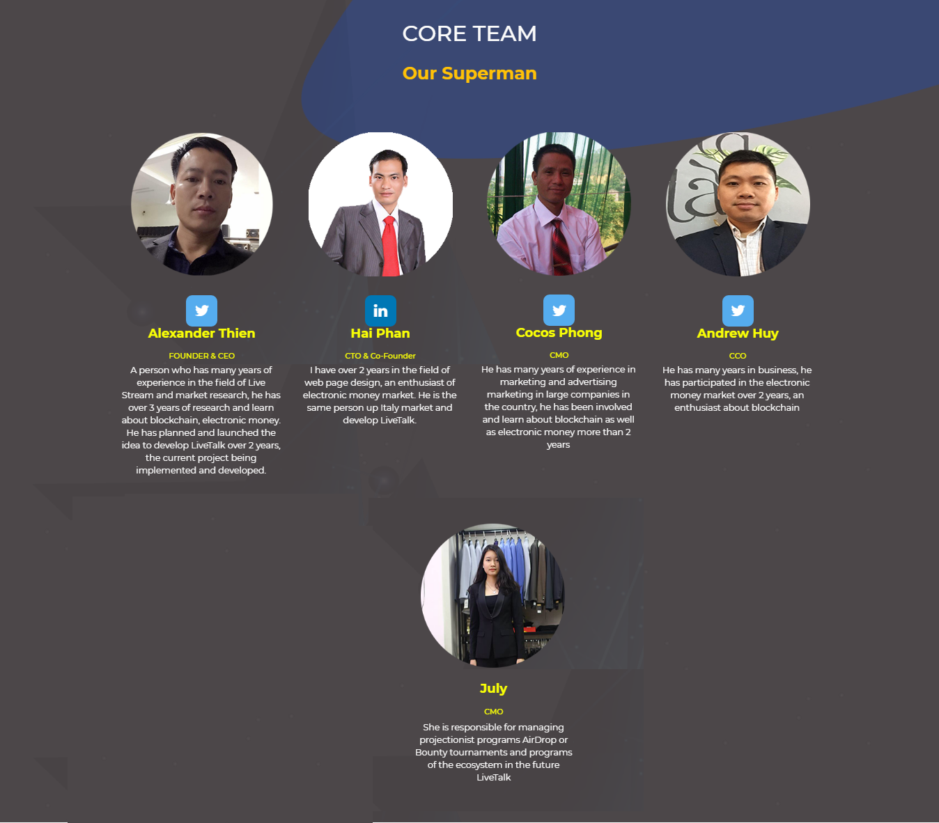 Community organizations: LiveTalk partnered with the big event party aims to bring users and the streamer, the creators of content have fun place, Exchange, meet. We use blockchain to control the transaction and payment (token), and we have our own platform for communication, transactions and transactions in real time.