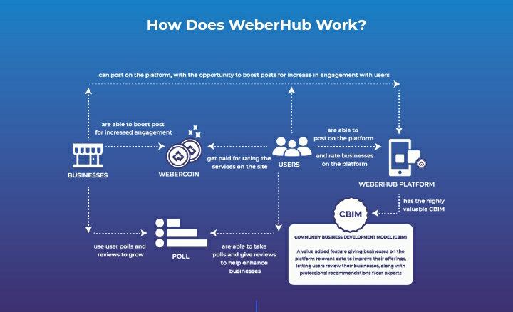 Na plataforma WeberHub, os proprietários de empresas são recompensados por anunciar na plataforma e usuários pela classificação ou recomendação da empresa.