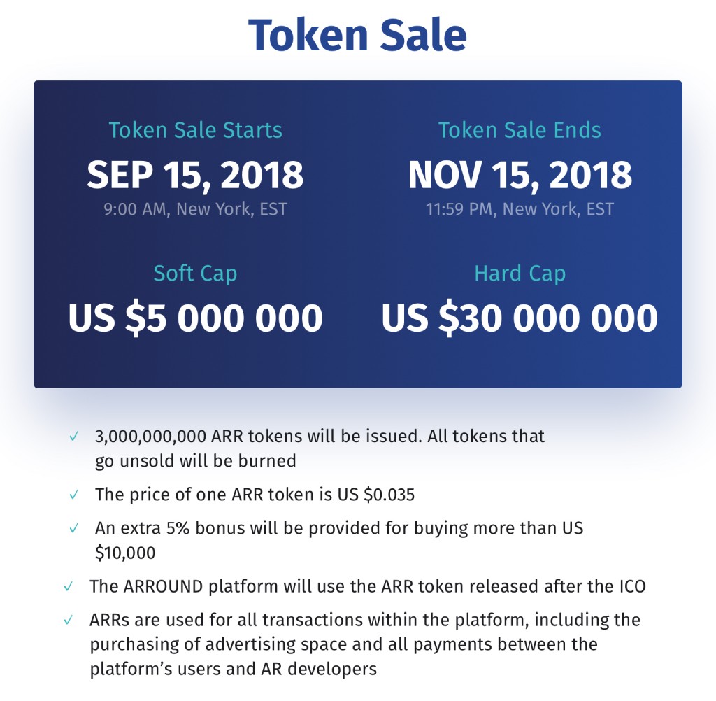 The total number of ARR tokens to be released into circulation is 3,000,000,000 tokens. The Around Token Generation Event (T.G.E) was scheduled for 2 different phases; The Presale took place from the 27th of February to the 1st Day of May, 2018 while the Public Crowdsale was timed for the 15th of September spanning through to the 15th of November 2018. After which the ARR tokens would become available for trading as a cryptocurrency on various exchanges.