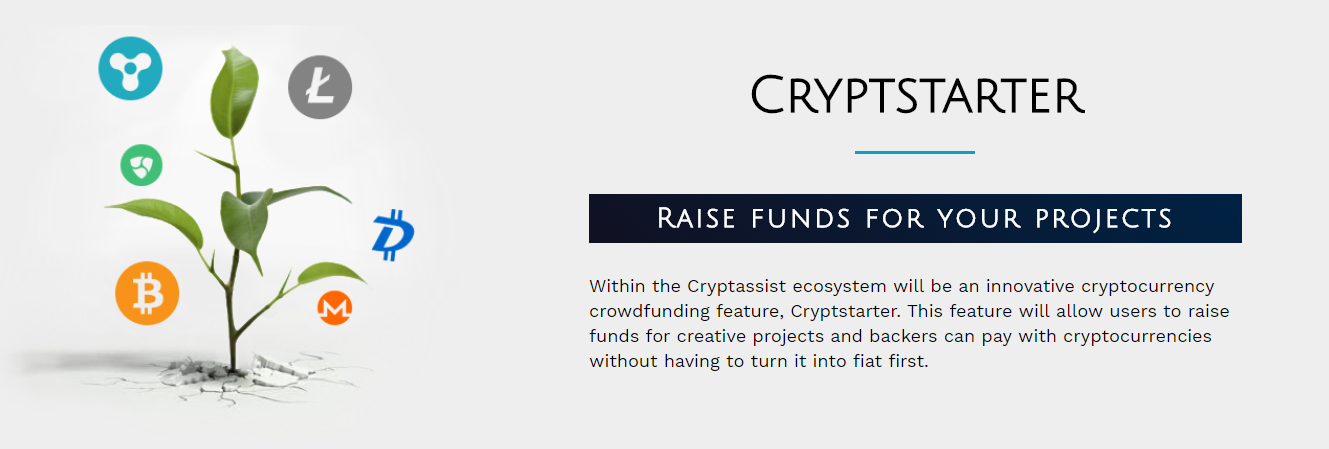 This is a fund raising technique, it allows project to launch their fundraising on Cryptassist, get ratings, feedbacks with suggestions from the community, users would pay in cryptocurrencies without having to exchange to fiat and this looks like a great place for new projects and investors as Cryptstarter will require KYC for both creators and backers of the project to track that creators deliver their products or services when the project has finished.