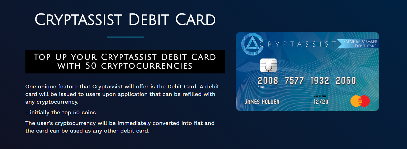 “At Cryptassist we understand that the market is not lacking in coins, tokens, exchanges, crypto news and a plethora of specialist sources for a crypto user to seek data and information so that they can best manage and build their portfolio. Cryptassist will allow for cryptocurrency to be useable for everyone in everyday life, not simply through trading tools, notifications and alerts on an easy to navigate, customizable platform, but through the abundance of every day usable features that are outlined in detail throughout this document, including a Debit Card, that can be refilled using the top 50 cryptocurrencies, fulfilling a potentially unlimited demand in the market.”