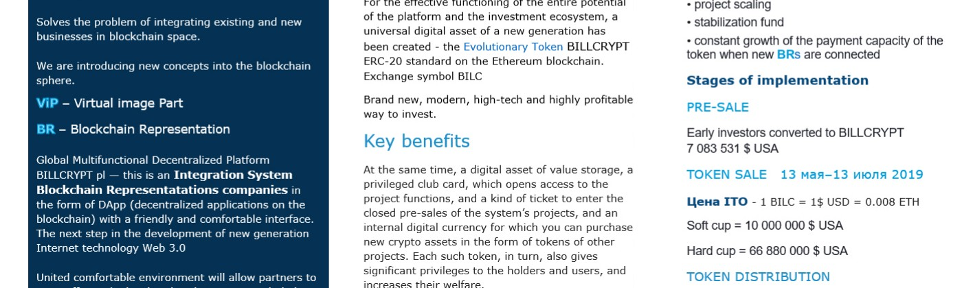 Therefore, the integrated BILLCRYPT pl system will become an indispensable environment for creating a Blockchain representation and will be extremely useful for business, investors and ordinary users. A marker BILLCRYPT has a strong opportunity to reach the highest position in the ranking of electronic money.
