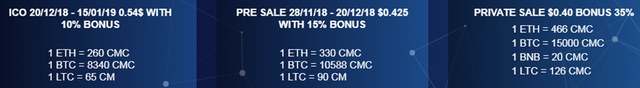 De naam van het token is CMC. Token is momenteel het standaard utility ERC 20-token dat is gemaakt op het Ethereum-netwerk en heeft de mogelijkheid en compatibiliteit om te doen wat elke andere standaard ERC20-token doet.