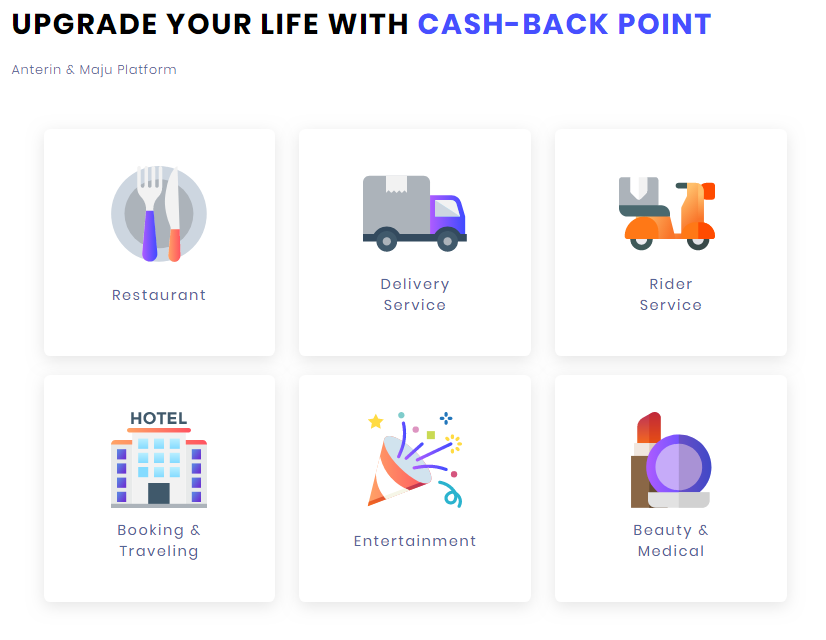 Tergantung pada tingkat keanggotaan Anda, Anda akan diberikan berbagai manfaat seperti poin cash back dan voucher perjalanan. Selain layanan Anterin, cash-back point dapat digunakan untuk berbagai kegiatan konsumsi melalui pusat perbelanjaan Internet yang terhubung dengan Aplikasi Anterin.
