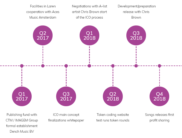 The profit will be distributed over 6 years (until December 2023) and will include all income streams associated with the songs created thanks to this ICO. This includes Spotify clicks, Youtube views, Vimeo views, iTunes downloads, events related to song promotion, pay-per-view and booking, international organizations' fees for rights implementation (PRO), which they pay us every time when the song is played around the world, and much more.