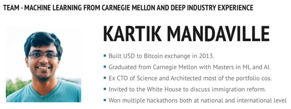 Kartik Mandaville has a very exceptional resume for a founder. He has had an exceptional amount of experience, even within the blockchain industry having built a BTC:USD exchange several years ago. He has also won multiple hackathons which suggest he is an exceptional developer.