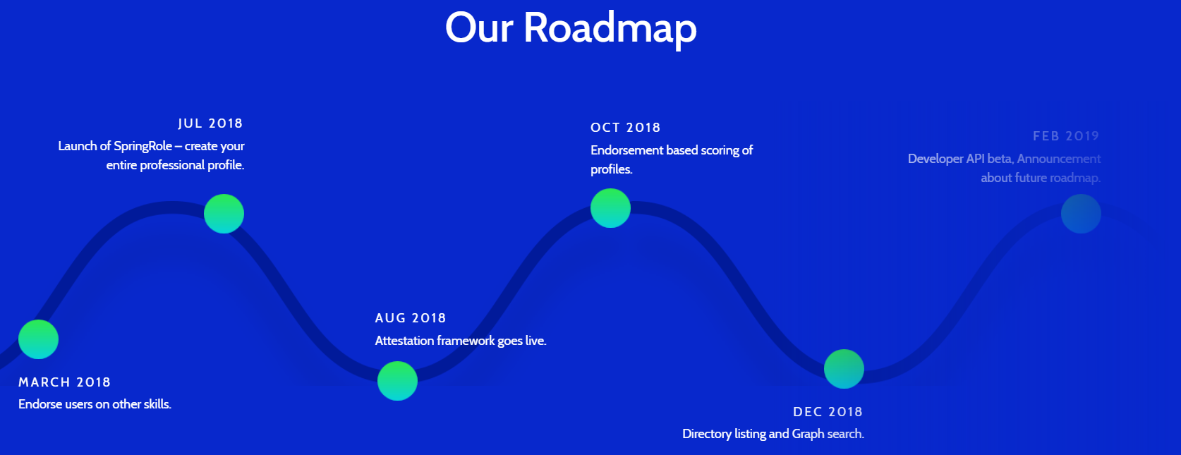As seen above, this is the roadmap SpringRole roadmap. They have currently built facilitated the ability for a professional profile to be made, but the next big milestone on the roadmap is for the attestation framework to be implemented in August. This will be key month, in bringing the SpringRole vision into fruition.