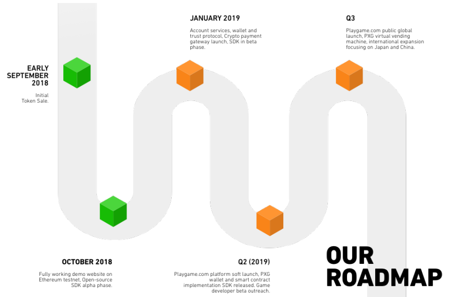 Q2 2019 - Playgame.com platform soft launch, PXG wallet, and smart contract implementation SDK released. Game developer beta.