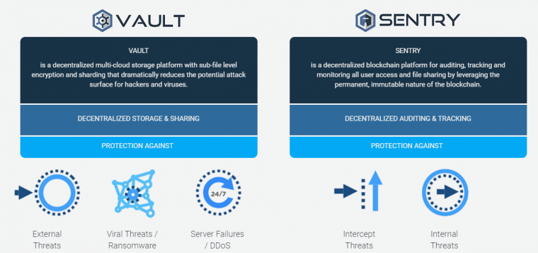 o VAULT - это децентрализованная платформа облачного хранения. Каждые отдельные данные вначале зашифровываются, а затем нарезаются на 5 различных частей. Второй раз программа зашифровывает каждую индивидуальную часть, а затем отдельно хранит эти части на пяти основных свободных поставщиков облачных хранилищ (предположим, это Google, Amazon, IBM, Box и т.д.). Это защищенная от взлома платформа с несколькими облачными хранилищами гарантирует, что любые похищенные данные есть бессмысленные для внешних хакеров, а также предотвращают работу вирусов и вредоносных программ. Стоит сказать, что любые ключи шифрования находятся только на личных устройствах пользователя и автономной резервной системе. В облаке не хранятся ключи шифрования.