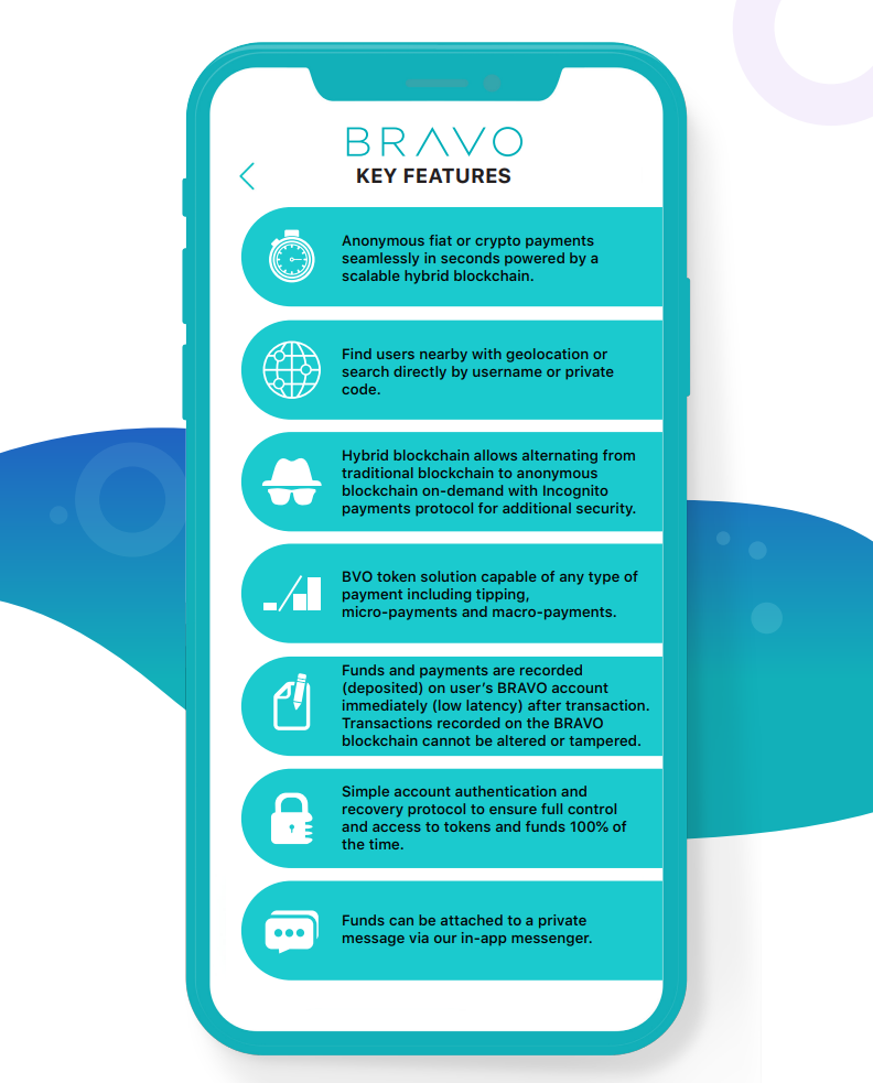 BRAVO has set itself the task of creating a completely anonymous mobile payment platform with a user-friendly interface that would be easy for individual consumers and for commercial use. Access to the application will be through a simple pin (after necessarily KYC)
