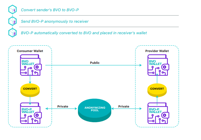Open transactions will be registered in the blockchain and will be available for viewing as in the Ethereum and Bitcoin networks and will use the BVO token. But, when the user will need to make a completely anonymous transaction, he can use the Bravo Private Coin (BVO-P) tokens, which exclude the possibility of determining the address of the transaction obtained, as well as its sender. If the platform user wants to conduct an anonymous transaction, the system will automatically perform the following steps.