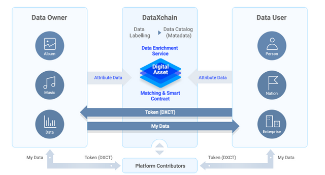 Further, subject to the transaction, the seller receives DXT tokens in payment, and the buyer has access to the download and use of information.