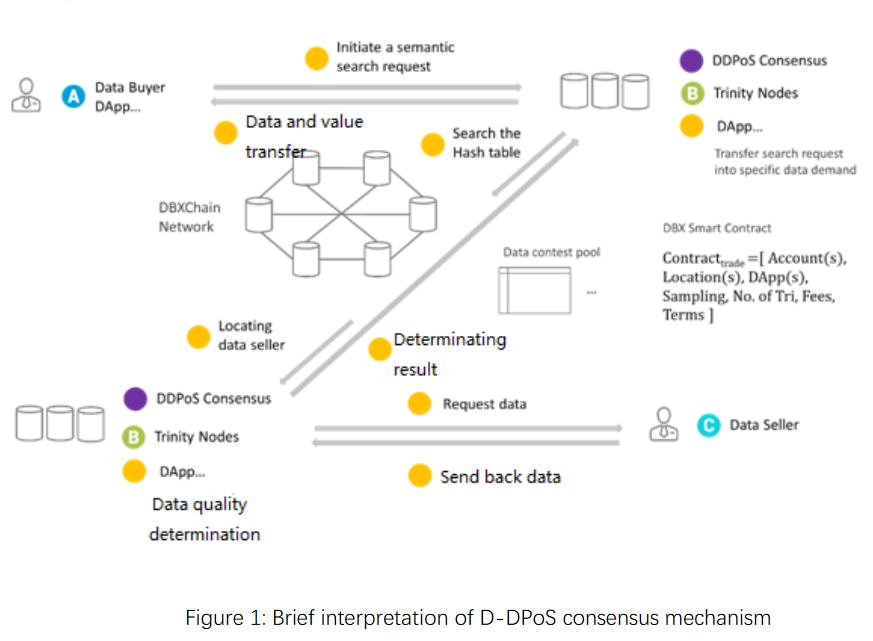 "On the classical internet, to make an application, we need to analyze data demand, find out data source, purchase, and load data. This is an extremely time - wasting process. Instead, through its globally distributed blockchain network supported by Trinity Nodes (the key nodes that undertake fundamental function services of DBXChain) as well as data demand analysis/quality supervising dApp as consensus, followed by highly automatic and autonomous data value transferring, DBX could make the whole procedure (analyzing demand –matching source –exchanging data and transferring value) be accomplished automatically."