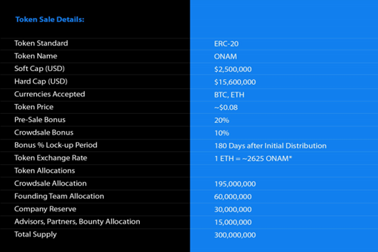 The ONAM ICO will begin on October 1st with an end date set at December 1st or until all 195,000,000 tokens made available for the crowdsale are sold out, whichever comes first.