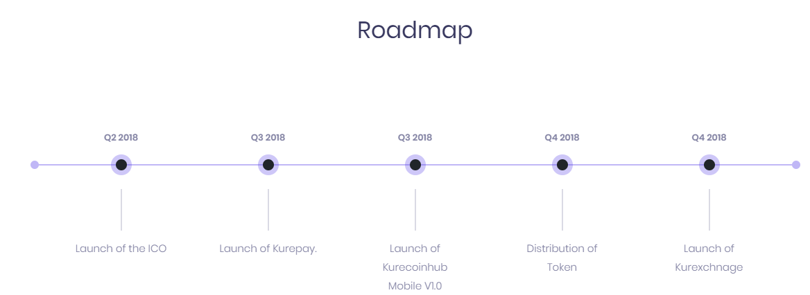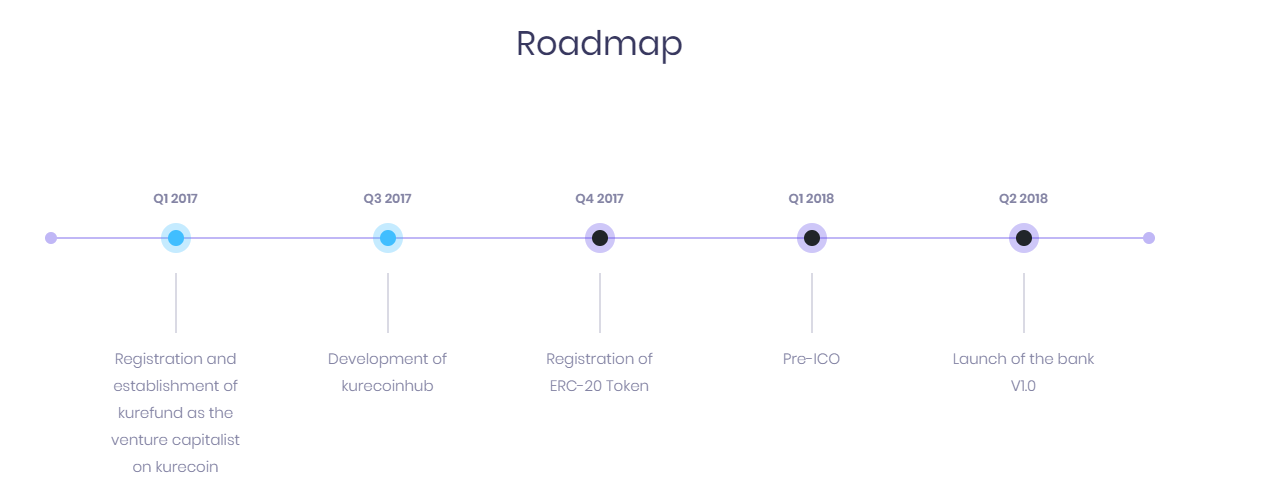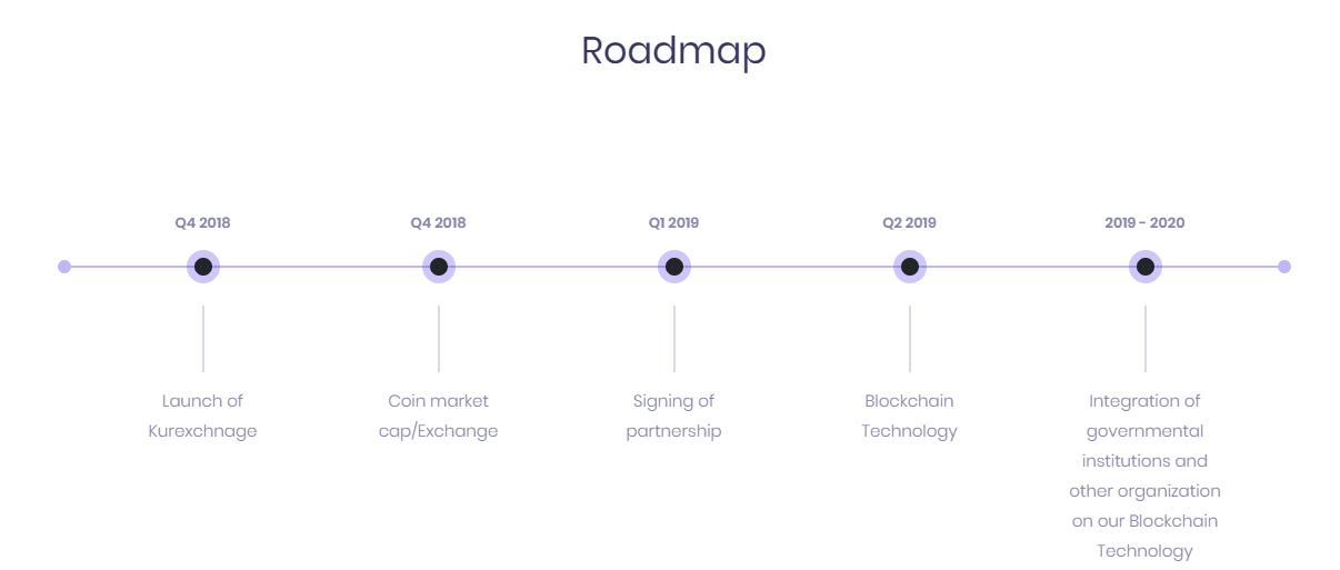 Первым с чего начала компания это регистрация и создания капитала для компании KureCoin. Далее в третьем квартале 2017 года они развивали kurecoinhub. В четвёртом квартале регистрация токена ERC-20. В конце 2018 года планируется запуск kurexchange. А в период с 2019 по 2020 год компания планирует интегрировать в государственные учреждения и другие организации на своей технологии Блокчейн.