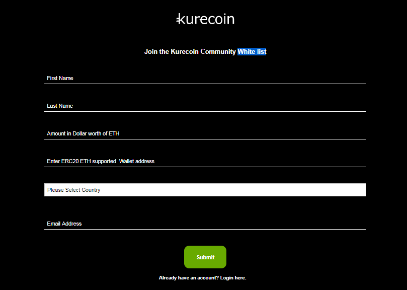 Для вступления в сообщества KureCoin, не нужно заморачиваться и нужно просто найти в конце сайта кнопку с надписью: WhiteList, нажать на неё и откроется следующее окно в котором вы сможете примкнуть к сообществу KureCoin. Всё что нужно сделать это заполнить поля информацией.