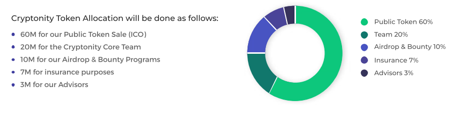 Cryptonity Token will run natively off the Ethereum Blockchain. We are planning to develop our own Blockchain in the near future and we will start working on it right after our Token Sale is finalized. They will issue a fixed amount of 100M (one hundred million) Cryptonity Tokens. We will never increase that amount or repurchase our Tokens. Manipulating our token such as decreasing the total supply to create deflation is usually against our ethical policy and the worst way to gain respect from the community, the traditional market and the regulators.Cryptonity Token will be an utility token and its price shall thus be related to its utility. Our token will grant its owners a lifetime discount of 50% on Cryptonity Exchange fees.