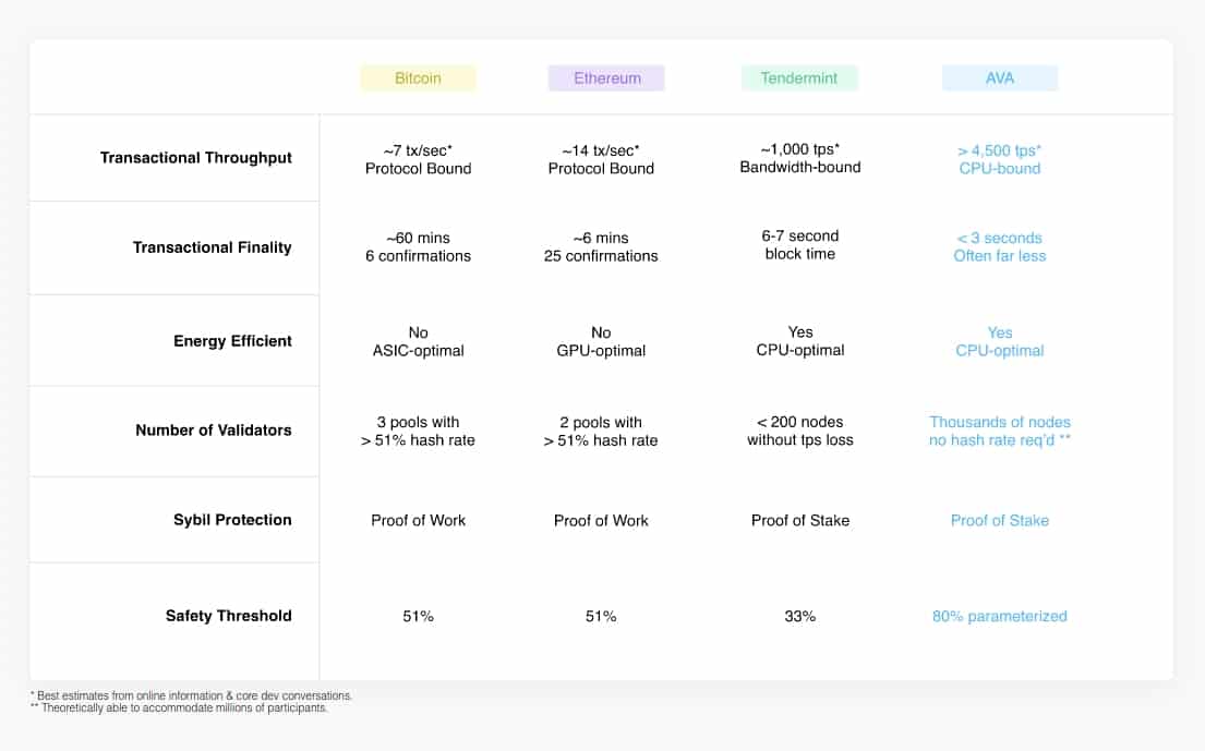 In terms of technology and integration we cant say AVAX has no match for popular and big projects. Take a look on this comparison image Ive seen of Bitcoin, Ethereum, Tendermint and Avax.