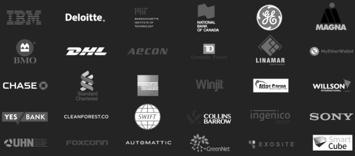 Среди партнеров бросаются в глаза крупные и известные компании, например: IBM, Национальный банк Канады, MIT, Deloitte, Sony, собственно система Swift. На изображении ниже представлены логотипы партнеров, 30 пунктов, крупных известных компаний, что уже говорит о многом.