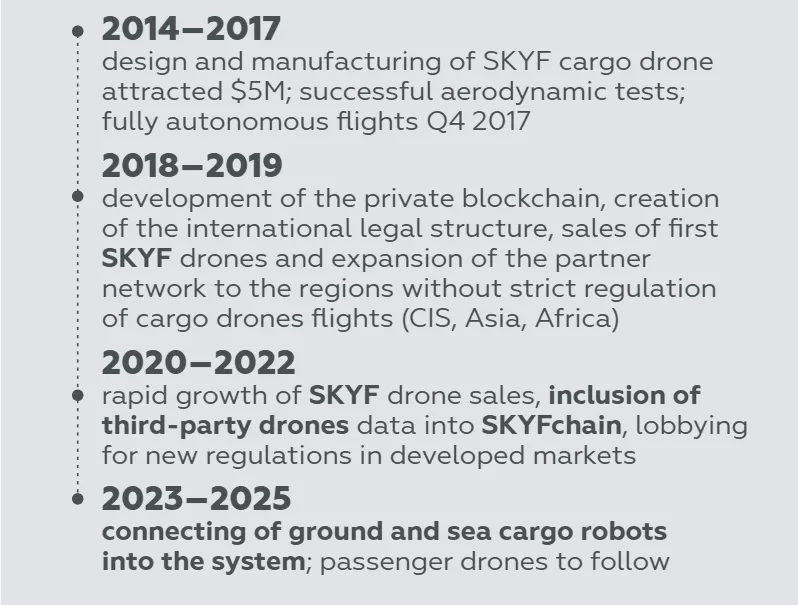 SKYFchainas ablockchainwith built-insmart contracts will providetrusted source of data and reasonable control over unmanned assets for clients, logistics operators, insurance and leasing companies, banks,and authorities worldwide.