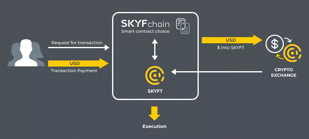 A user requests a transaction in SKYFchain and pays securely in fiat money through his smart contract SKYFchain acquires SKYFT tokens at a crypto exchange to execute the transaction.