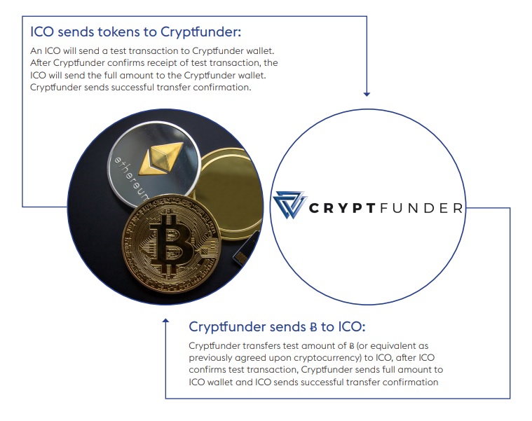 At first ICO sends tokens to Cryptfunder and only then Cryptfunder sends ICO cryptocurrency.